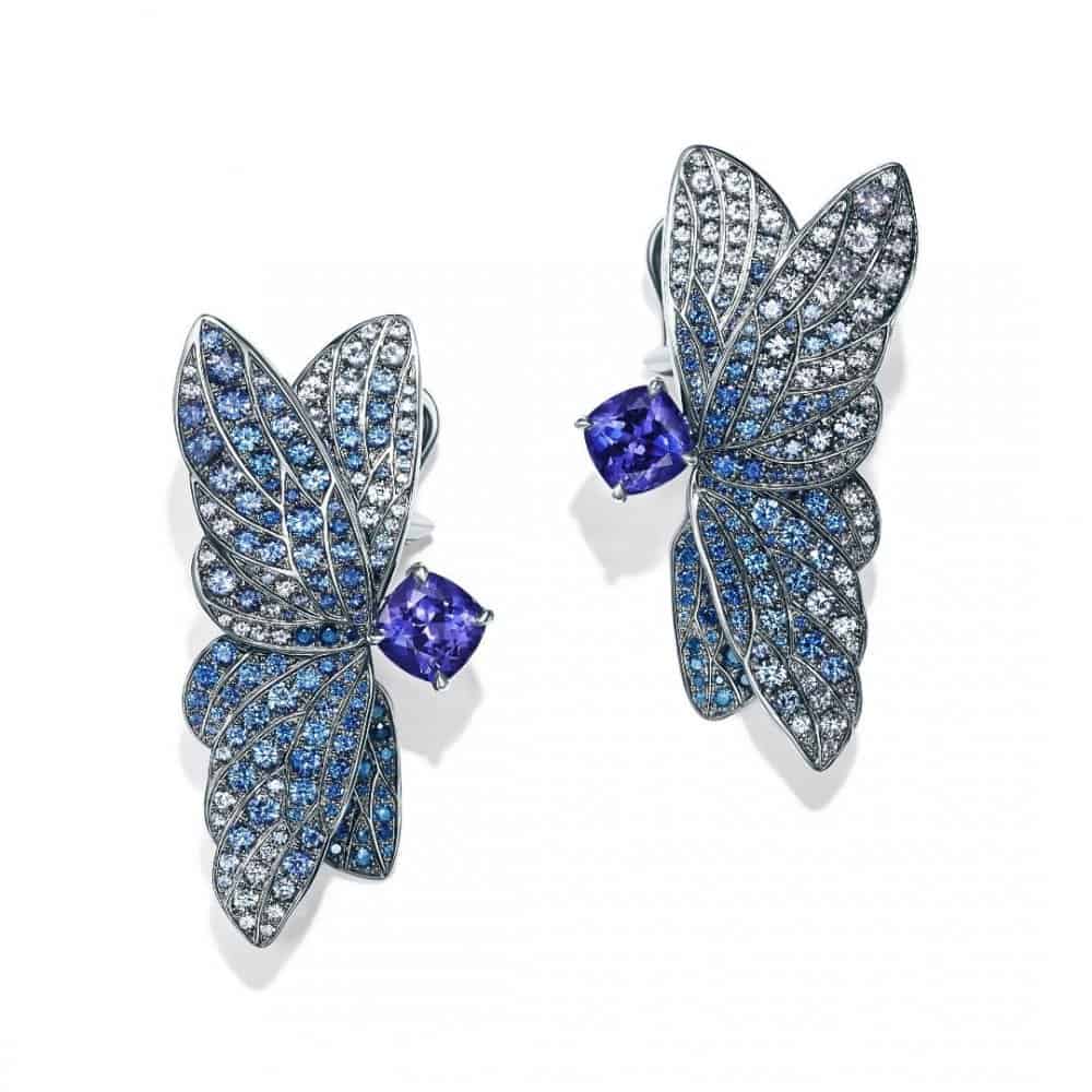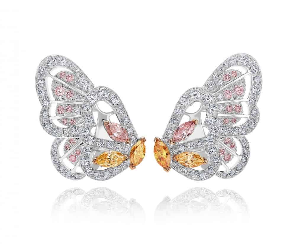 في هذا التصميم المبدع نقدم لك أقراط العلامة الفرنسية فان كليف أند أربلز Van Cleef & Arpels المرصعة بالألماس والعديد من الأحجار الكريمة الأخرى ذات الألوان المختلفة في تصميم على شكل فراشة بأسلوب ناعم كله أنوثة، بينما أصدرت الماركة البريطانية دي بيرز De Beers أقراط على شكل فراشة بأسلوب زخرفي فني آسر حيث تجسد أيضا الورود مع الفراشة.