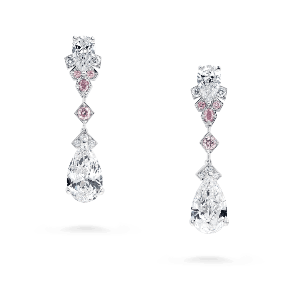 نقدم لك هذه الأقراط الخاصة بعلامة المجوهرات الفاخرة البريطانية ديفيد موريس، والمصنوعة من الذهب الأبيض المرصع بالألماس بلونين الأبيض والوردي، في تصميم أنثوي فاخر وراقي، وتندرج هذه الأقراط من مجموعة Electric Geometric.