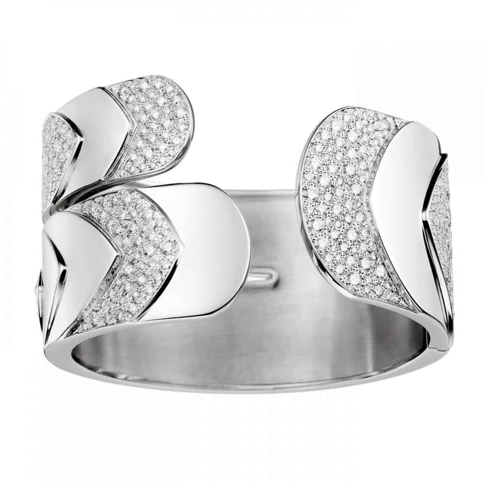ومن دار بوشرون نقدم لك سوار عريض أبيض متميز، صنع من الذهب الأبيض ذو 18 قيراط وزين بأحجار الماس التي اختلفت أحجامها حسب شكل التصميم، وهو مناسب لحفلات رأس السنة.