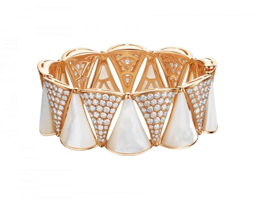 سوار عريض مصنوع من الذهب الوردي ذو 18 قيراط، وقد رصعت باللؤلؤ وأحجار الماس الأبيض ليكون شكل السوار وكأنه تناظر بين اثنين من الأساور الفاخرة.