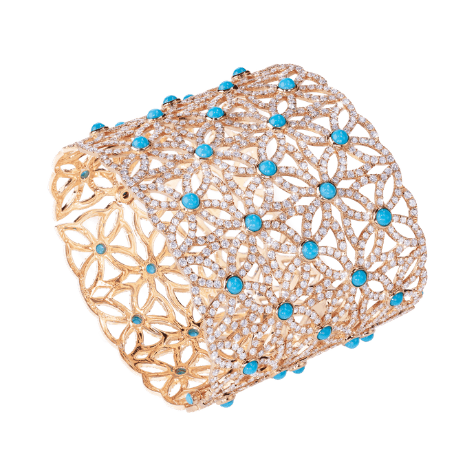 سوار من العلامة المتألقة بياجية من الذهب الورد 18 قيراط مرصع بأحجار الماس والفيروز المميزة، بتصميم على شكل ازهار على الأساور العريضة.