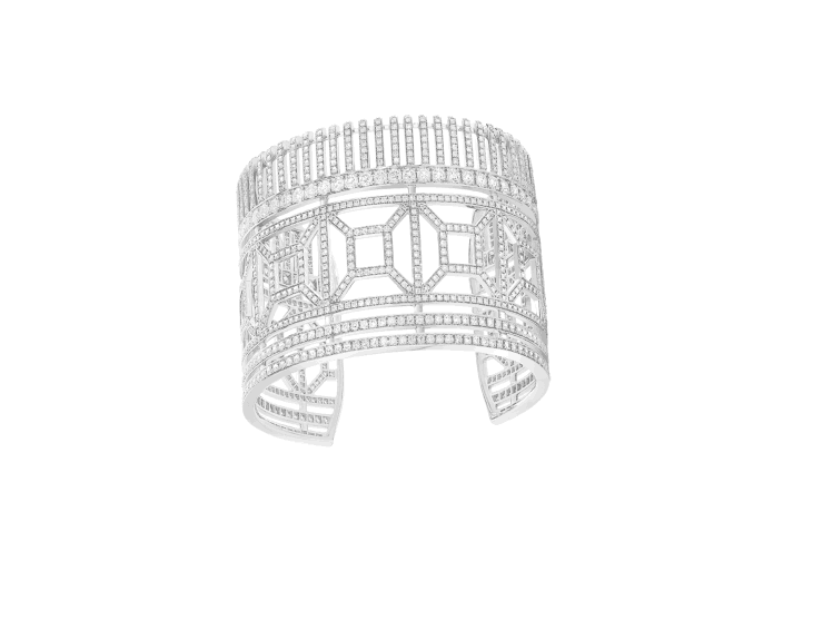اخترنا لك من دار ميسيكا للمجوهرات هذا السوار العريض والأنيق بتصميم يمزج بين الطابع العصري والتقليدي، وقد صنع من الذهب الأبيض وزين بأحجار الماس صغيرة الحجم.
