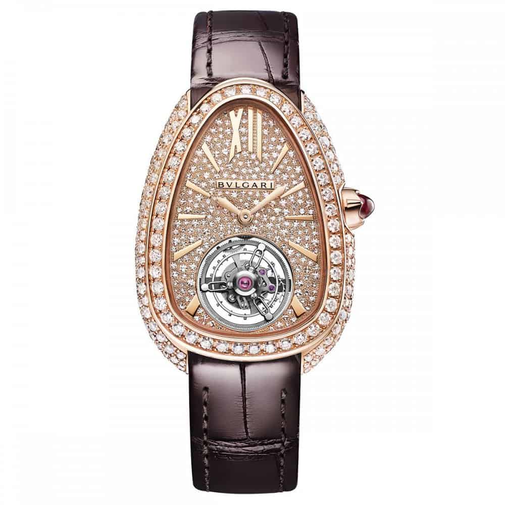 من العلامة الإيطالية بولغاري، التي شهدت العديد من الإضافات والتطورات في تصاميم ساعاتها، وخاصة التي صممت بأسلوب سيربنتي، نقدم لك أبرز إصداراتها الجديدة ساعة Serpenti Seduttori Tourbillon التي تأتيك بتوربين، وقد رصعت بالألماس بشكل به كلي في تصميم أنيق وفخم للغاية.