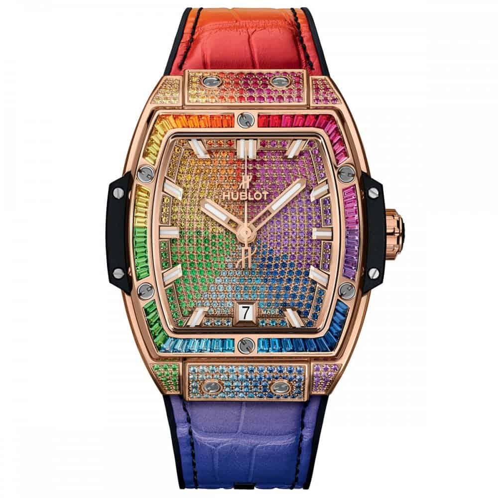 إليك هذا الإصدار الرائع الخاص بدار الساعات السويسرية هبلوت وهي ساعة Spirit Of Big BangRainbow التي تتزين بقطع الياقوت بألوان مختلفة تجسم ألوان قوس قزح، ويتميز هذا الموديل بتصميمه الذي يمزج بين الأسلوب الرياضي والفخامة بطريقة ساحرة.