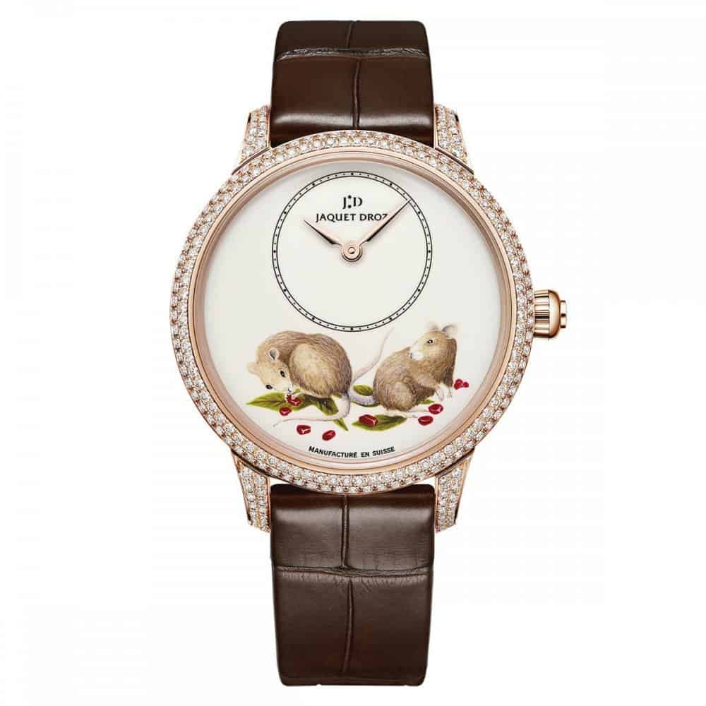ومن مجموعة Petite Heure Minute الخاصة بعلامة جاكيه درو السويسرية المختصة في الساعات، أضافت الماركة إصدار جديد بمناسبة هذا العام وهي ساعة Petite Heure Minute Rat j تحتوي على رسومات فأر وهو رمز هذه السنة 2020 بالتقويم الصيني، وتتزين الساعة بالألماس بأسلوب أنيق.