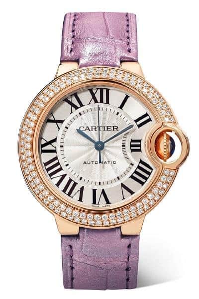 الساعة المميزة Ballon Bleu de Cartier من دار المجوهرات الفخمة الفرنسية كارتييه Cartier بتصميم عصري صنعت من الذهب الوردي المرصع بالألماس مع قطعة من حجر الياقوت، بالإضافة إلى سوارها البنفسجي الفاتح المصنوع من جلد التمساح.