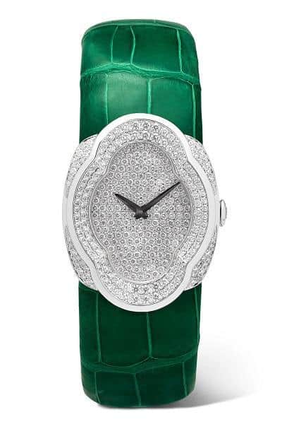 لمحبات الساعات الغاية في الفخامة نقدم  لك من العلامة الإيطالية بوتشيلاتي Buccellati ساعة Opera بتصميم مميز يأتي على شكل وردة مزينة بالكامل بالألماس اللامع مع سوار من جلد التمساح بلون أخضر زمردي وهو ما زادها جمالا على مستوى تصميمها.