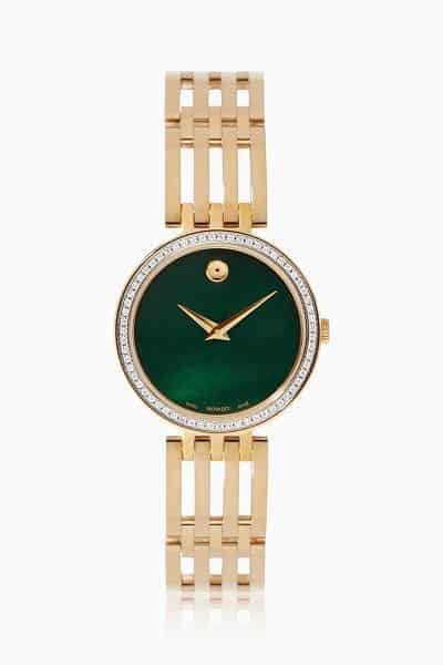 ساعة Esperanza من دار موفادو Movado الأمريكية ذات الأصل السويسري المميزة والفريدة بالمينا ذو اللون الأخضر والموجود بها النقطة التي تميز الماركة عند الساعة الثانية عشر.