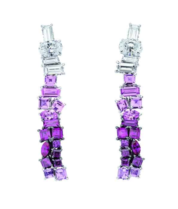 وبتصميم بألوان رائعة من الذهب الأبيض المزين بالألماس والياقوت البنفسجي والوردي نقدم لك أقراط ديور من مجموعة Gem Dior.