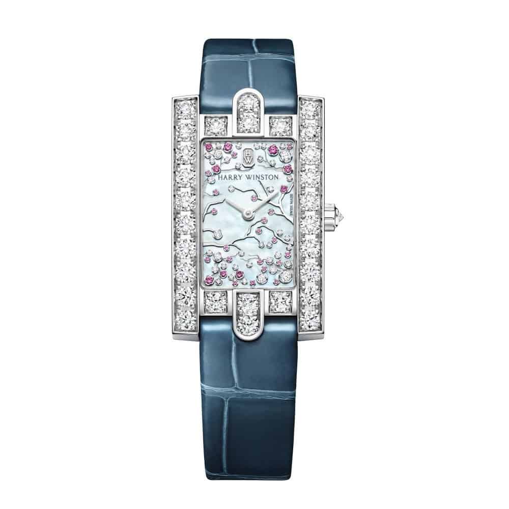 من ماركة هاري وينستون Harry Winston، نقدم لك هذه الساعة ذات التصميم الشاعري بإطارها الهندسي، تعتبر هدية غاية في الرقي بمناسبة عيد الحب، حيث تقدمها لنا العلامة من الذهب الأبيض الذي تزينه قطع الألماس مع لمسة من الياقوت الوردي.