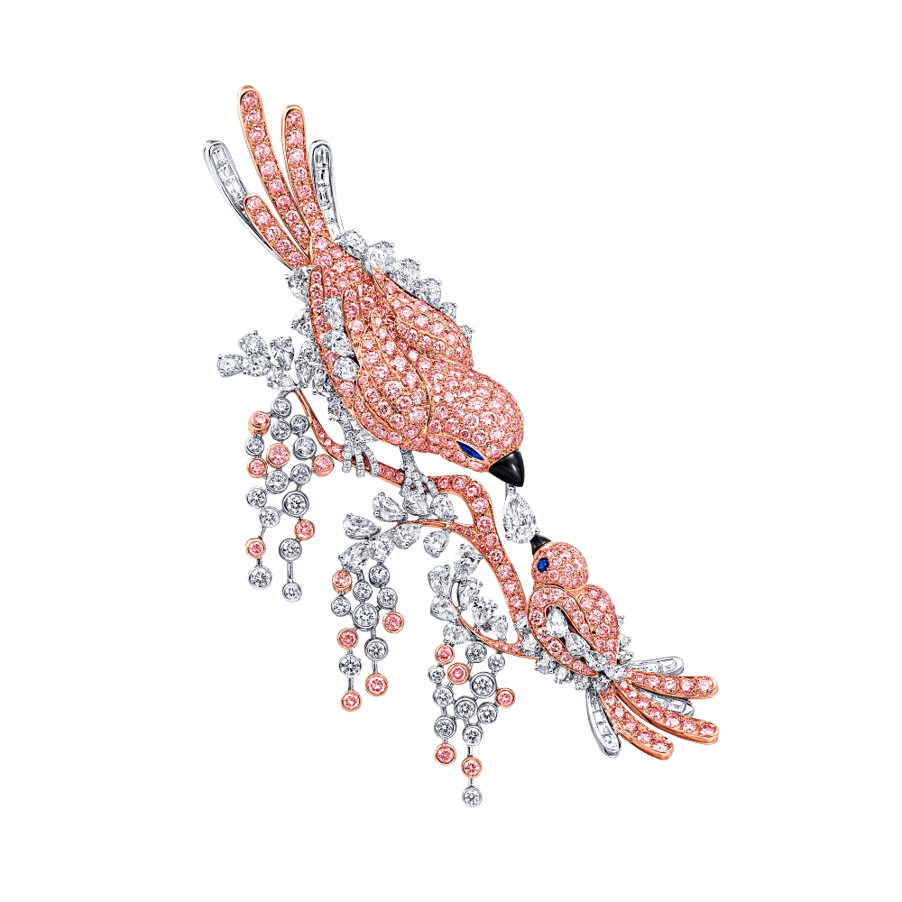 من دار المجوهرات البريطانية غراف نقدم لك منها بروش مغطى بالألماس والياقوت مع قطع من الأونيكس، في شكل عصافير.
