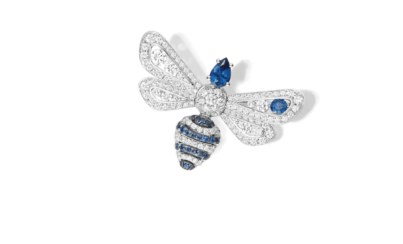 إليك بروش دار المجوهرات شوميه الذي صنع من الذهب الأبيض ويتزين في أغلبيته بالألماس البراق مع قطع من الياقوت ذو اللون الأزرق. يتميز هذا الموديل بشكله الذي يشبه النحلة.