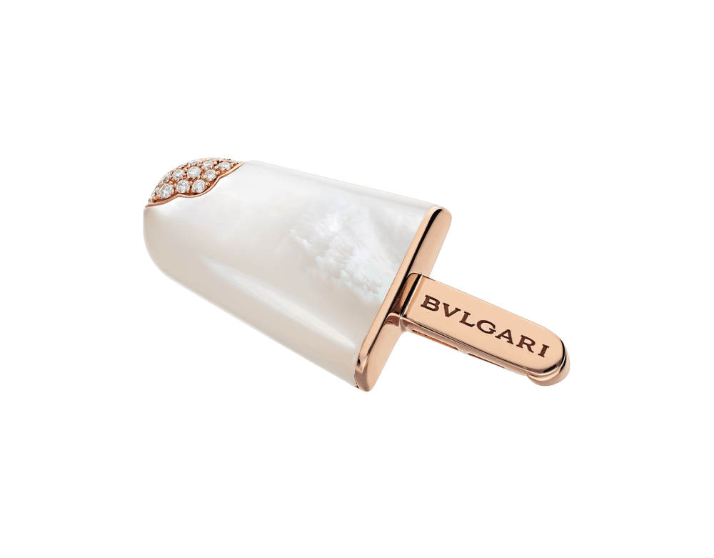 وفي تصميم ناعم وجذاب في شكل قطعة مثلجات نقدم لك بروش من مجوهرات بولغاري الإيطالية، تم صنعه من الذهب الوردي عيار 18 قيراط بشكل أنيق ورصع بلمسة من الألماس.