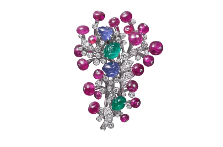 ومن العلامة الفرنسية كارتييه نأتي لك ببروش صنع من البلاتين الذي يحتفي بأنواع متنوعة من الأحجار الكريمة بألوان مختلفة وهي الألماس، الياقوت باللون الأزرق والروبي والزمرد، في تصميم أنيق.
