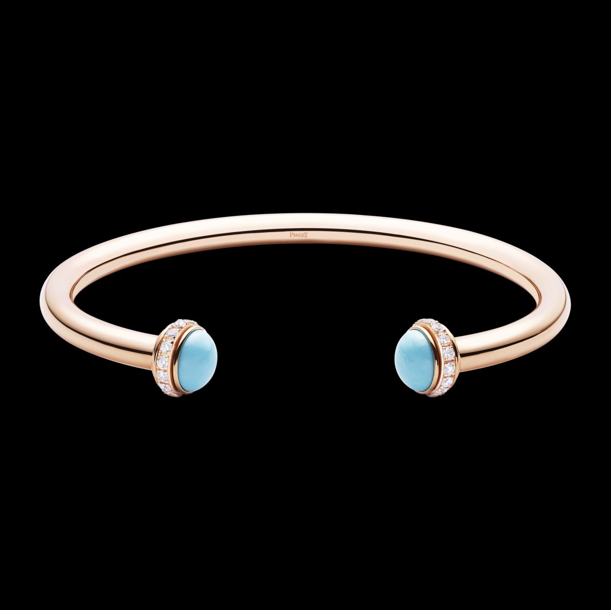 اخترنا لك من ماركة بياجيه خاتم صنع من الذهب الوردي بطريقة ساحرة وتزينه قطع من الألماس وقطعتين من حجر الفيروز، في تصميم مفتوح، عصري وأنيق بأسلوب فخم.