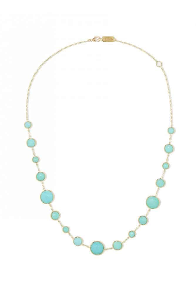 وبتصميم أنثوي وجذاب نقدم لك هذا العقد الخاص بعلامة المجوهرات إيبوليتا، والذي يأتيك من الذهب الأصفر المرصع بقطع مستديرة من حجر الفيروز.