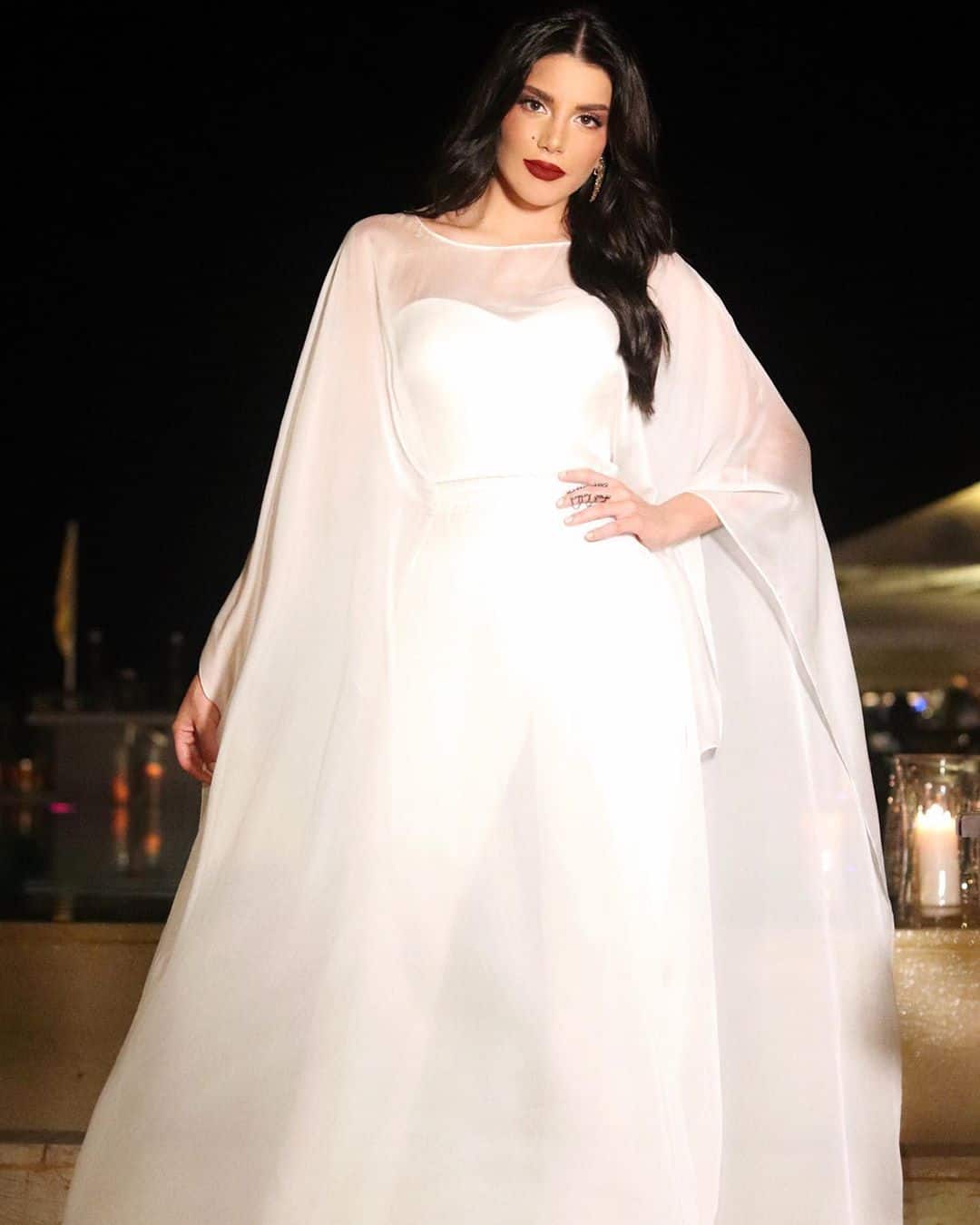 أبدعت الممثلة اللبنانية في اختيار إطلالتها بإحدى ليالي رمضان من خلال ظهورها بفستان فاخر باللون الأبيض يحمل توقيع لمصمم البارع أنطوان القارح، تمثل فستانها في جمبسوت باللون الأبيض الناصع وفوقه قطعة كالجلابية من قماش الشيفون الأبيض لتظهر مثل الملاك، الأكمام المفتوحة من الشيفون زادت الفستان روعة، كما استخدمت أحمر الشفاه الأحمر وبعض المجوهرات في تزيين اطلالتها الفاخرة.