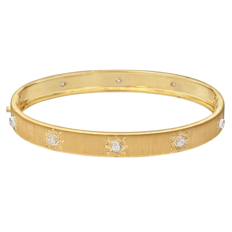 سوار من بوتشيلاتي ذو تصميم كلاسيكي مصمم من الذهب ومرصع بالألماس حتى تتمتعي بإطلالة فاخرة في حفل الزفاف.