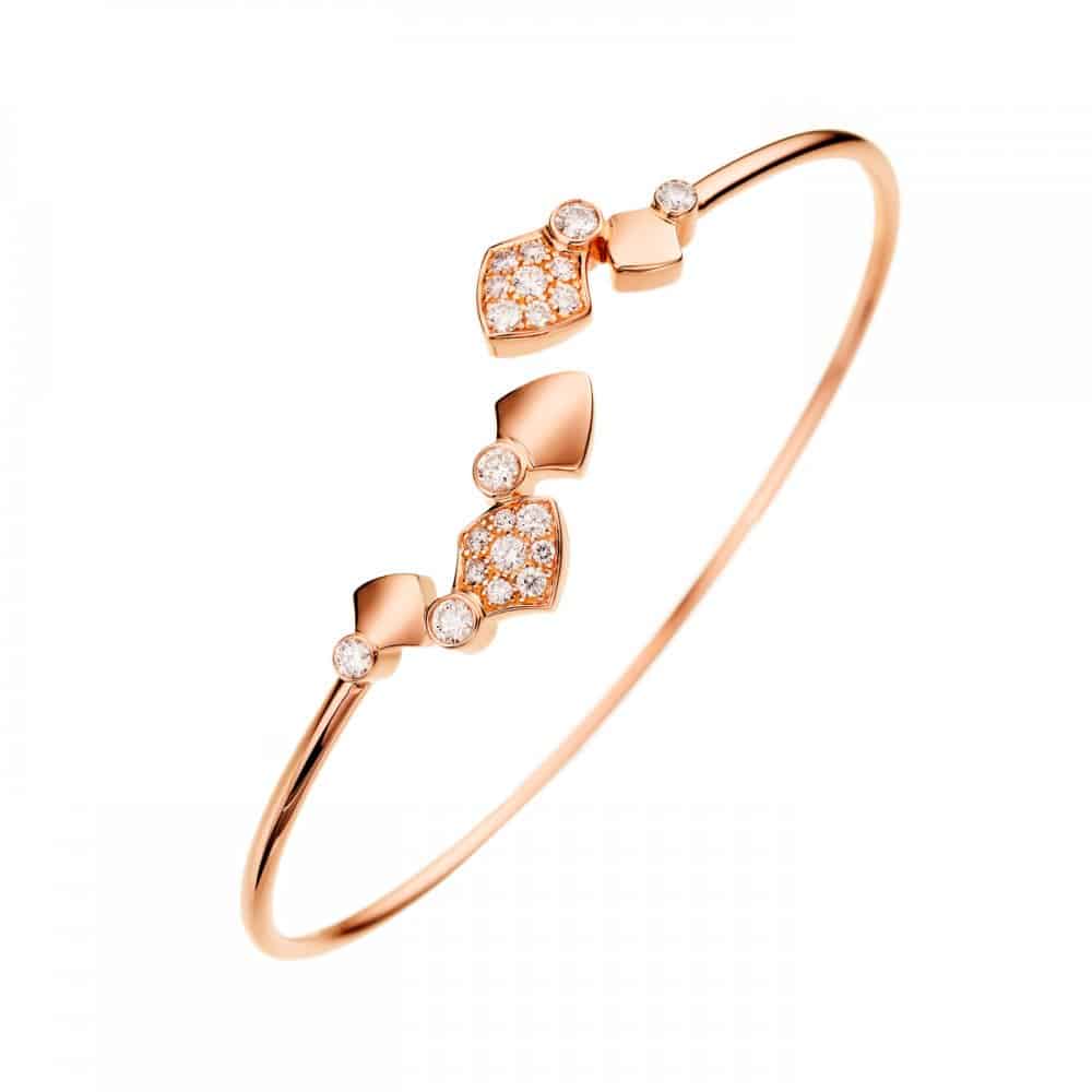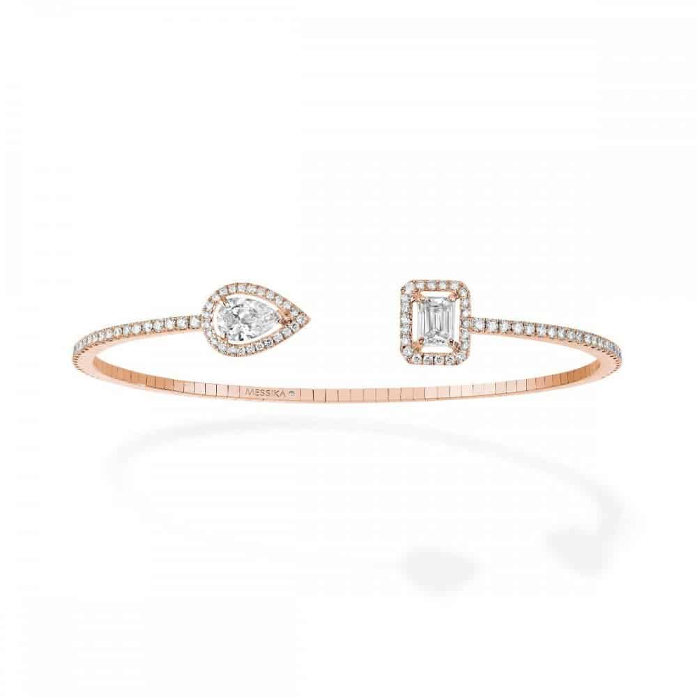 من علامة ميسيكا نرشح لك هذا السوار المصنوع من الذهب الوردي الذي يلفه الألماس وفي نهايتيه يوجد قطعتين اضافيتين من الألماس ذات الشكل المربع والكمثري في الوسط، في تصميم ناعم.