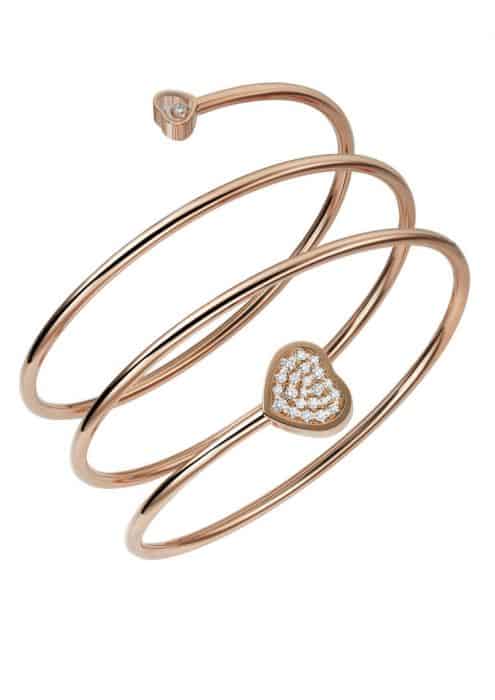 إليك هذا السوار الخاص بالعلامة السويسرية الأخرى شوبارد المصنوع من الذهب الوردي الذي تم ترصيعه على شكل قلب من قطع الالماس اللامع، في تصميم يلتف حول معصمك بثلاث دوائر.