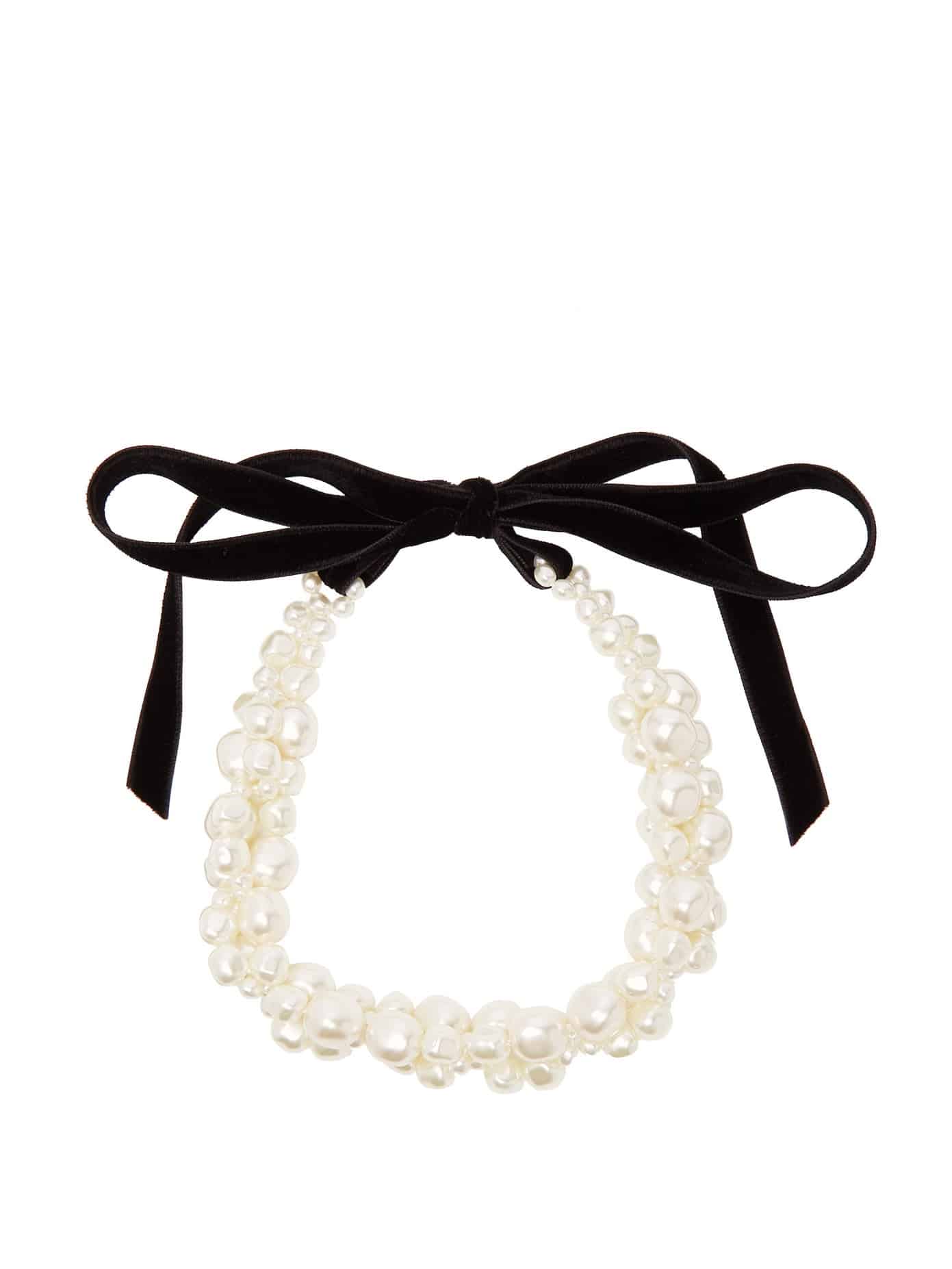 وبتصميم مميز تتداخل به حبات اللؤلؤ نقدم لك عقدا مقدما من علامة سيمون روشا الذي سيتلاءم تماما مع صاحبات اللوك العصري ذو الأسلوب المجنون والمثير، والذي سيكون بمثابة تحفة على رقبتك بفضل حبات اللؤلؤ التي تتداخل بشكل غير منتظم وأنيق، وأما قفل السلسال فهو عبارة عن قماش فاخر مخمل بلون أسود تقومين بربطه على رقبتك بسهوله فيضيف إليك لمسة أنيقة.
