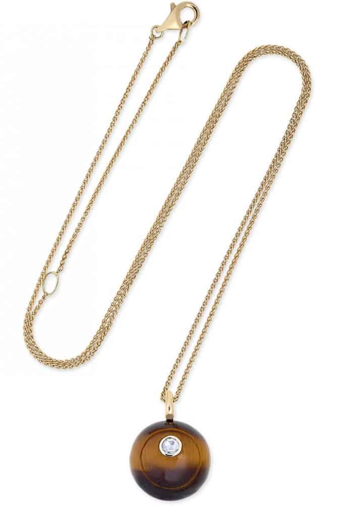 نبدأ مجموعتنا الخريفية بعقد علامة نور فارس الذي تم صنعه من الذهب الوردي بصورة أنيقة والذي تم تزيينه بالألماس مع حجر عين النمر، في تصميم راقي في شكل دائري.