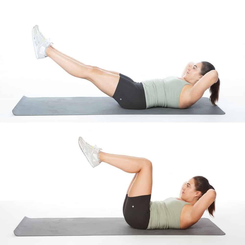 استلقي على ظهرك وامسكي بيديك من خلف الرأس وارفعي ساقيك مع ثني الركبتين وتوجيه القدمين للأعلى، حاولي رفع جسمك العلوي واحرصي على تقريب مرفقيك ليلامسا ركبتيك، من ثم ارجعي جسمك العلوي للأرض دون تغيير موضع يديك، وأعيدي التمرين.