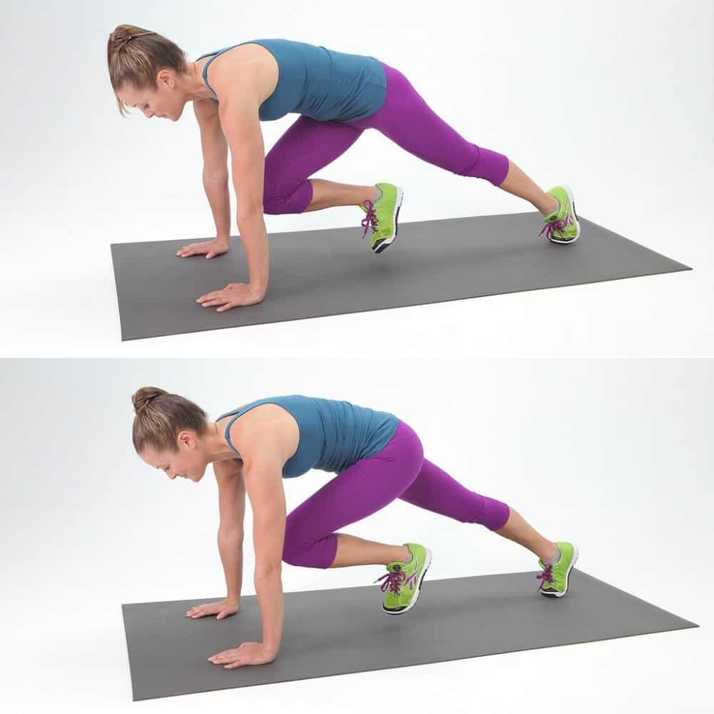 بعد اتخاذ وضعية Plank  الرئيسية قومي بتركيز ثقل جسمك على كعب قدميك مع الارتكاز على كفي اليد، من ثم اثني قدمك اليمنى لتقترب للمرفق الأيمن، بعدها القدم اليسرى باتجاه المرفق الأيسر وهكذا كرري العملية قدم بعد قدم.