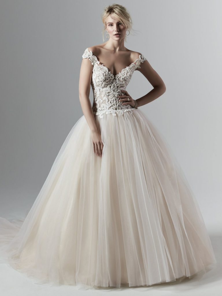 فستان زفاف منسدل الأكتاف، منفوش، ويتميز بزخرفة من الدانتيل على الصدر.