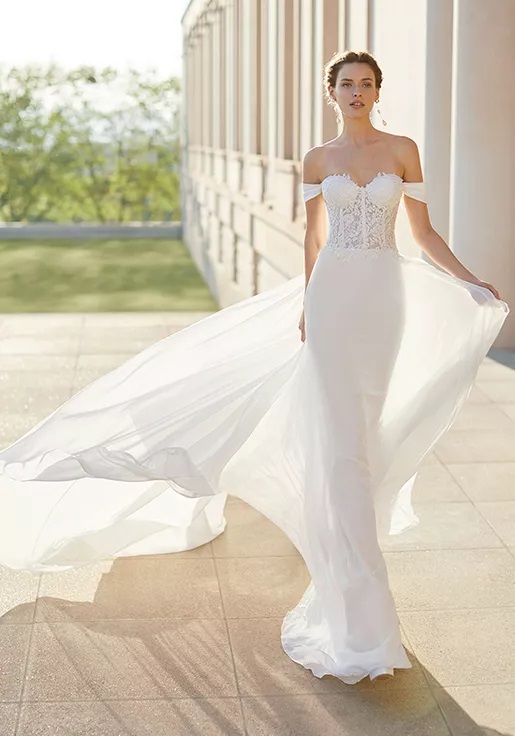فستان زفاف أوف شولدر مصنوع من الكريب، بقصة عروس البحر سينال حتمًا إعجابك.