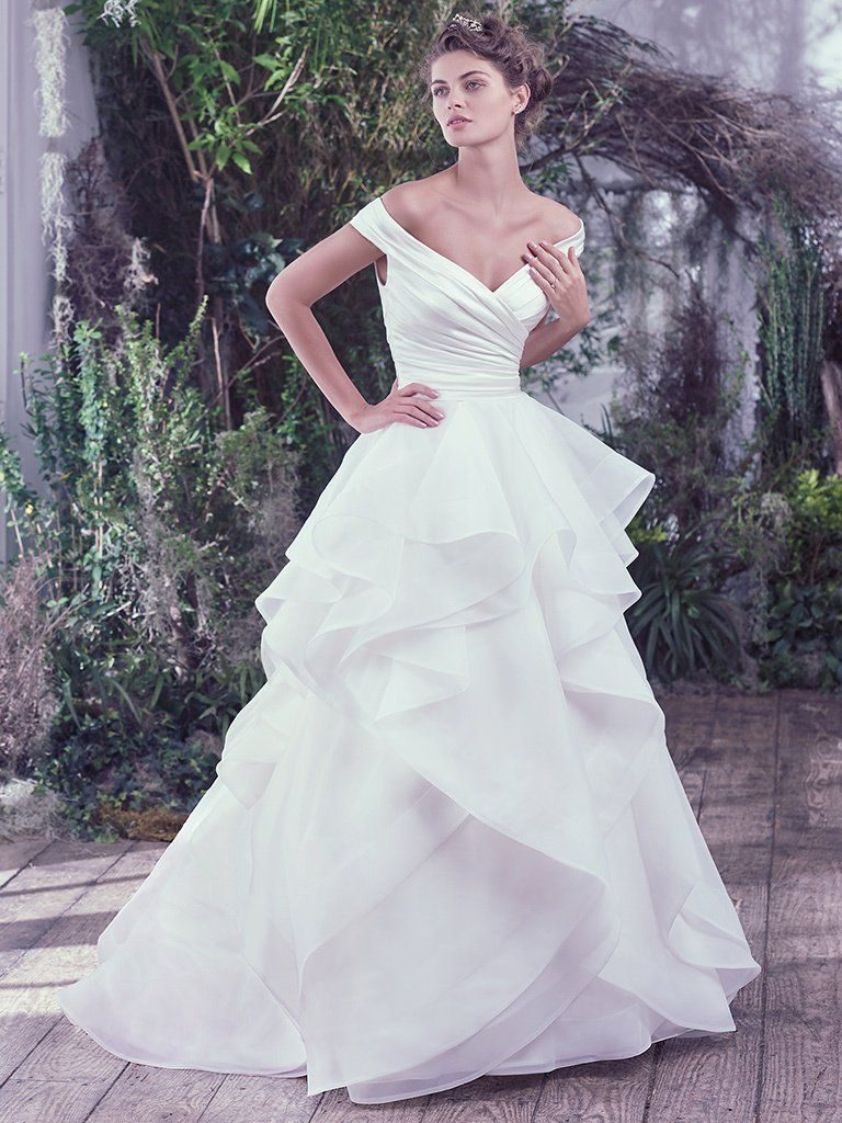 فستان زفاف اوف شولدر بقصة حورية البحر، مطرز ببلورات سواروفسكي وتنورة تحتوي على طبقات متعددة من الأورجانزا.
