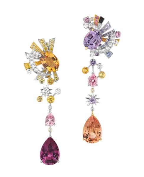 من دار المجوهرات شوميه اخترنا لك أقراط مجموعتها Les Ciels Des Chaumet الذي سيسحرك فيه جمال تصميم الذهب الأبيض الذي رصع بالألماس اللامع وأحجار كل من الامبريال توباز، الاسبنل الزهري، والياقوت البنفسجي،كما أن جمال شكله الجذاب للغاية مع لمسه رومانسية سيمنحك لوك مفعم بالأنوثة الناعمة.