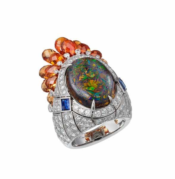 نقدم لك هذا الخاتم من علامة كارتييه الذي أصدرته ضمن مجموعتها Magnitude والمصنوع من الذهب الأبيض المزين بالألماس مع الأوبال، الغارنيت باللون البرتقالي والياقوت باللون الأزرق، في تصميم فخم جدا بلمسة كلاسيكية.