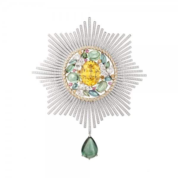 ومن مجموعة المجوهرات Le Paris Rusee De Chanel التي أصدرتها العلامة الفرنسية شانيل نقدم لك بروش تم صنعه من تشكيل من الذهب الأبيض والوردي المزين بالألماس وأحجار الاسبنل والتورمالين في تصميم جميل يشبه تلك الشارات التي كانت تستعمل في الأزياء الروسية قديما ليرتبط تصميمه بين أناقة البعد الكلاسيكي والحديث لجمال المجوهرات.