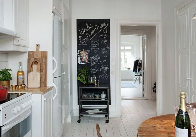 من الأفكار الشائعة مؤخرًا، طلاء السبورة، خاصة إذا كان لديك طفل، سيكون هذا الجدار من الأماكن المفضلة لديه، حيث عليك تحويل قسم من الجدار إلى تحفة فنية وقومي بطلائه مثل السبورة حتى تتمكني من كتابة كلمات حلوة عليه أو رسومات معبرة.