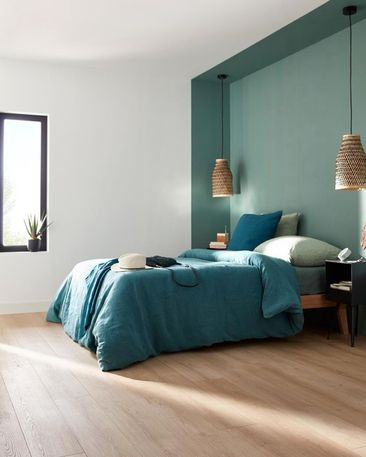 اللون الأخضر هو لون راقي وجذاب، يهدئ المزاج ويخلق أجواء مريحة منعشة في الغرفة، حيث يمكنك القيام بتدرجات من اللون الفاتح والغامق لتحديد تجويف السرير أو اختاري هذا اللون على حائط فقط من الغرفة.