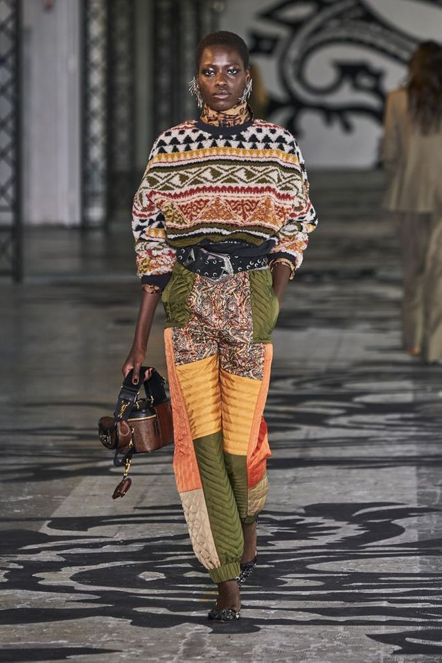 اعتمد الكثير من المصممين في هذا الموسم على التصاميم الهندسية والمطبوعات، حيث قاموا بمزج مجموعات من الأقمشة والجلود المختلفة إلى جانب السراويل الواسعة التي ظهرت بها عارضات Etro ، والمعطف من Dolce & Gabbana أو الفستان الطويل من Emporio Armani.