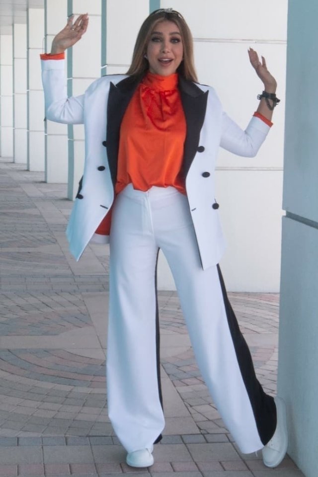 وللإطلالات الرسمية، تجنبت الظهور ببدلة كاملة، حيث اختارت بليزر مع بنطلون جينز وحذاء رياضي من نفس اللون، بليزر طويل على شكل فستان، بالإضافة إلى البدلة البيضاء التي قامت بتنسيقها مع توب بلون النيون.