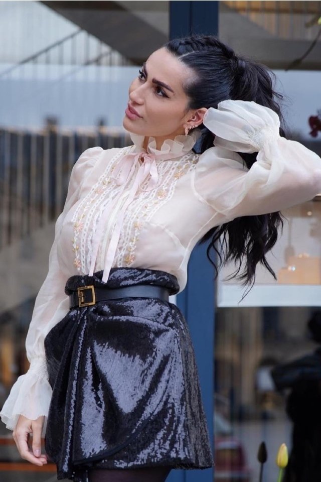 من التصاميم الرائجة كذلك هذا الصيف وبشكل كبير، البلوزة ذات الطابع الفيكتوري، والتي قامت ديالا مكي بتنسيقها مع تنورة مرتفعة الخصر، منحتها مظهر رسمي جذاب.