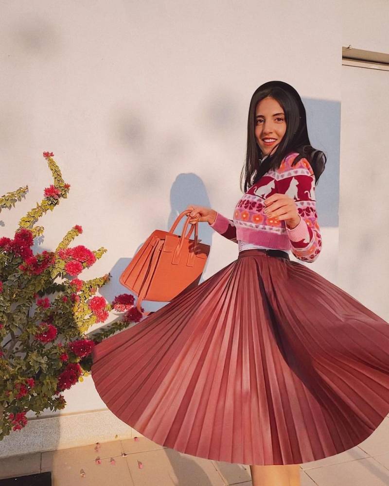 بسبب برودة الطقس في فصل الشتاء، نتجنب دائمًا ارتداء التنورة، في حين أنها تمنحنا إطلالة كلاسيكية. حتمًا ستنال إعجابك هذه التنورة البيليسية من الستان بخصر عالي ولون جذاب، قامت بتنسيقه مع بلوفر قصير من الصوف وحقيبة برتقالية.