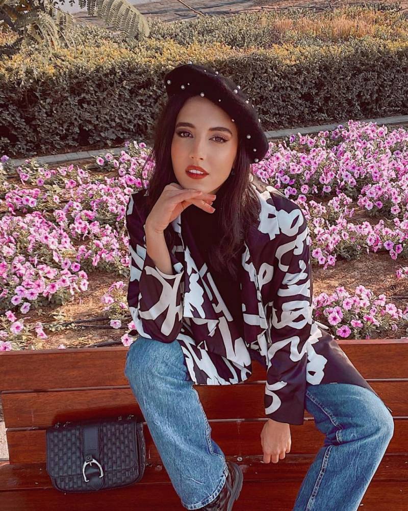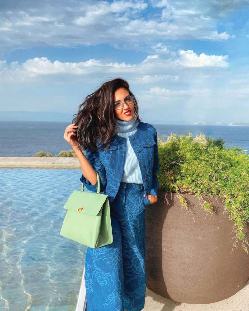 ستنال إعجابك هذه الإطلالة الكاجوال الجميلة، حيث ظهرت الفاشنيستا المصرية هادية غالب بطقم من الدنيم الفاتح والمزوق بالورد، حيث قامت بتنسيقه مع بلوفر خشن من الصوف وذو رقبة عالية وحقيبة باللون الأخضر المينت.