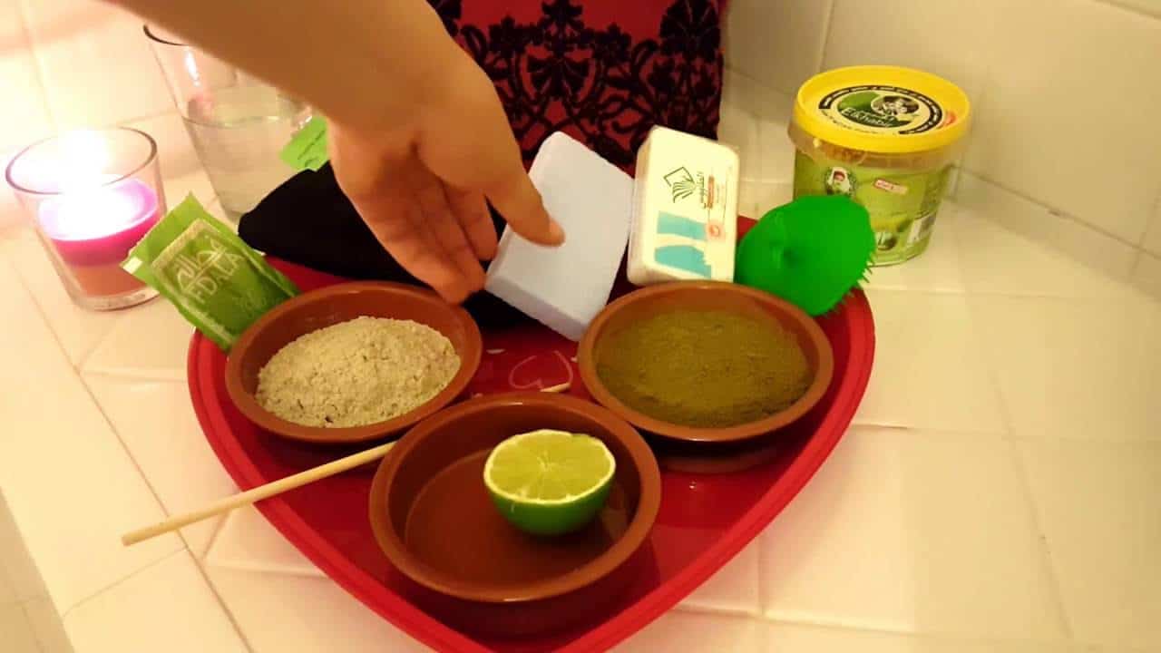 في الأثناء قومي بخلط كمية حسب الحاجة من الصابون المغربي مع عصير الليمون ومسحوق الحناء في القليل الماء الساخن حتى يتشكل لديك مزيج سائل طبقيه على كامل الجسم لمدة 10 دقائق على الأقل.