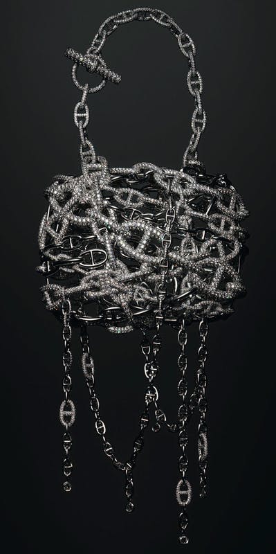 من المثير للدهشة أن الحزام المزخرف يمكن إزالته وارتداؤه كقلادة، مزودة بماسة كبيرة على شكل كمثرى عيار 8 قيراط في وسط الحقيبة كبروش. يصل سعر الحقيبة 1.9 مليون دولار.