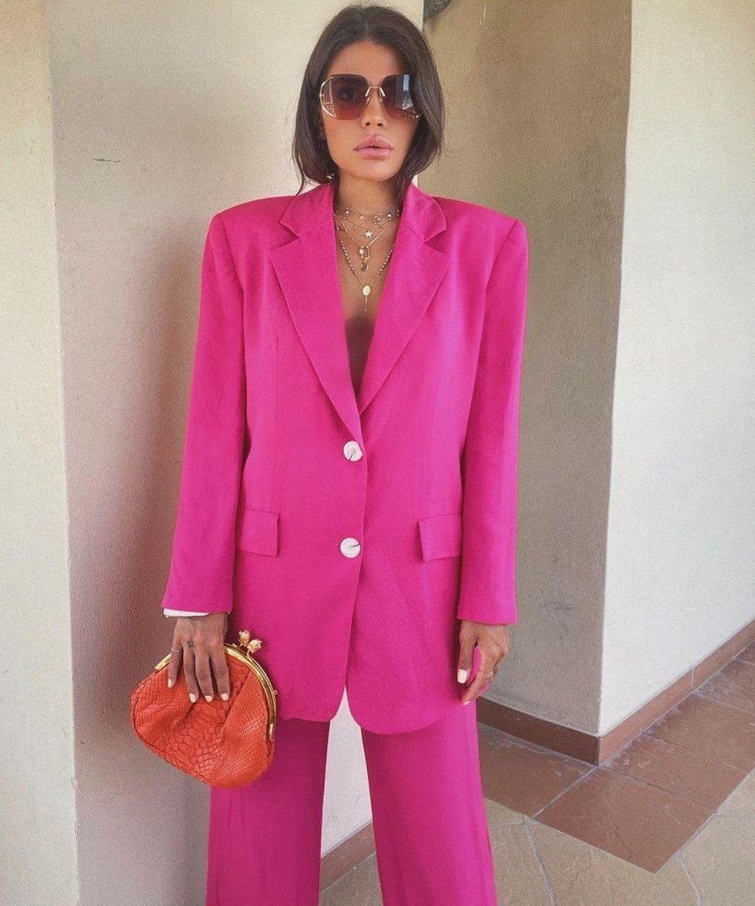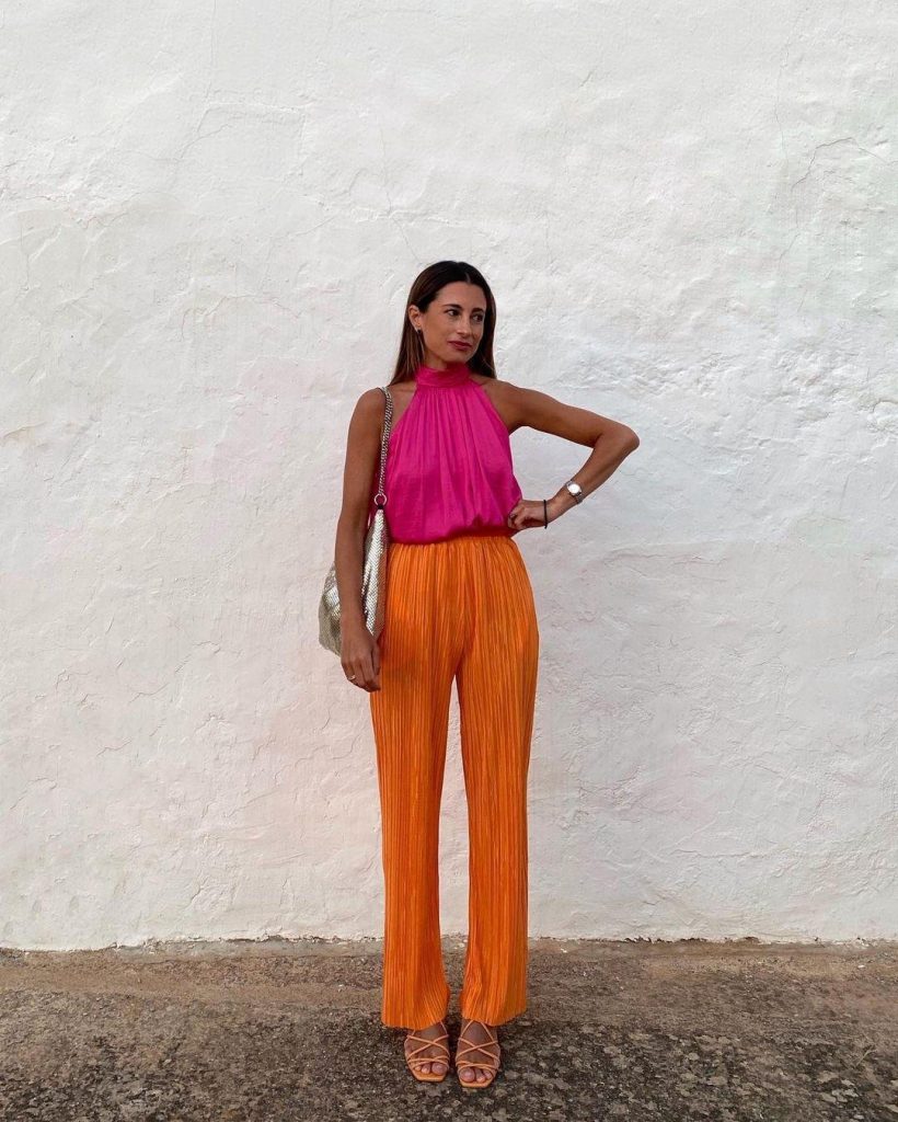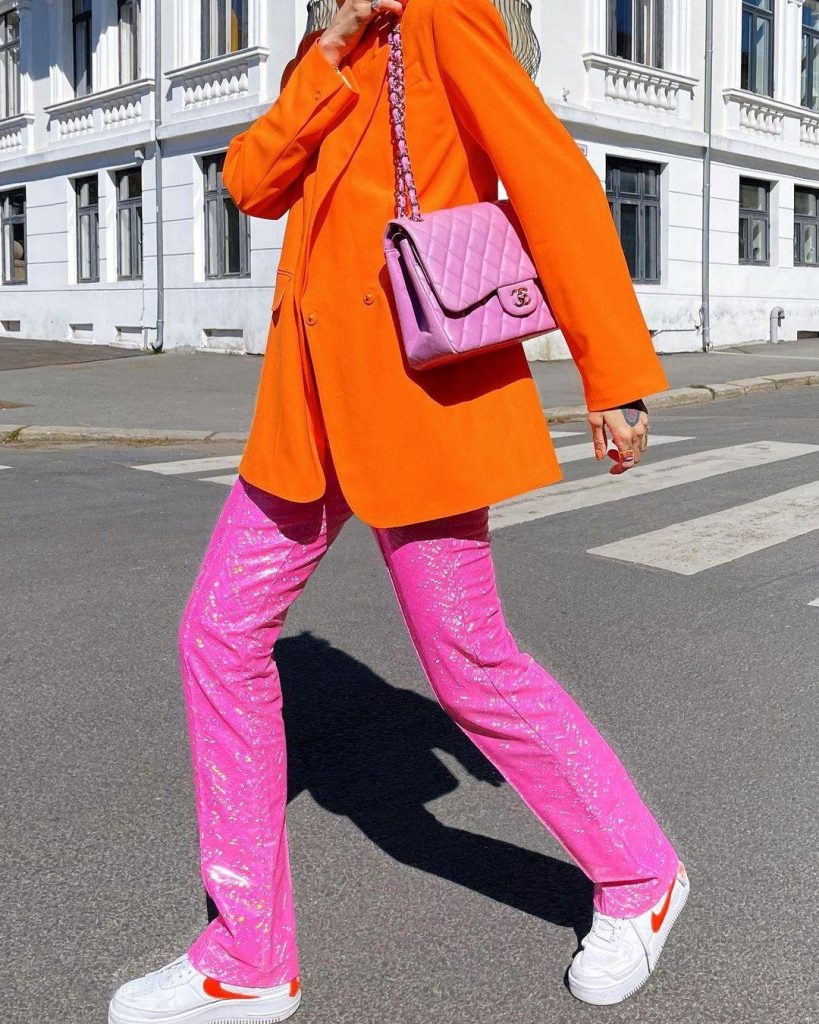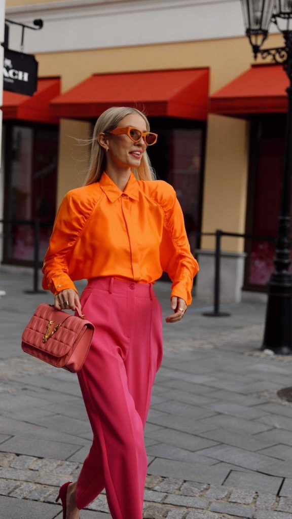 نقوم عادة بتنسيق الألوان الصارخة مثل البرتقالي أو الفوشيا مع ألوان محايدة، لكن هل جربت مزج هذه الألوان مع بعضها البعض. ستنال إعجابك إطلالة Leonie Hanne التي اعتمدت قميص مع سروال، وحقيبة وحذاء باللون الفوشيا.