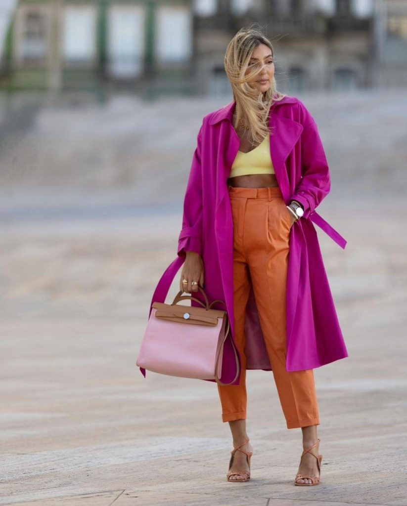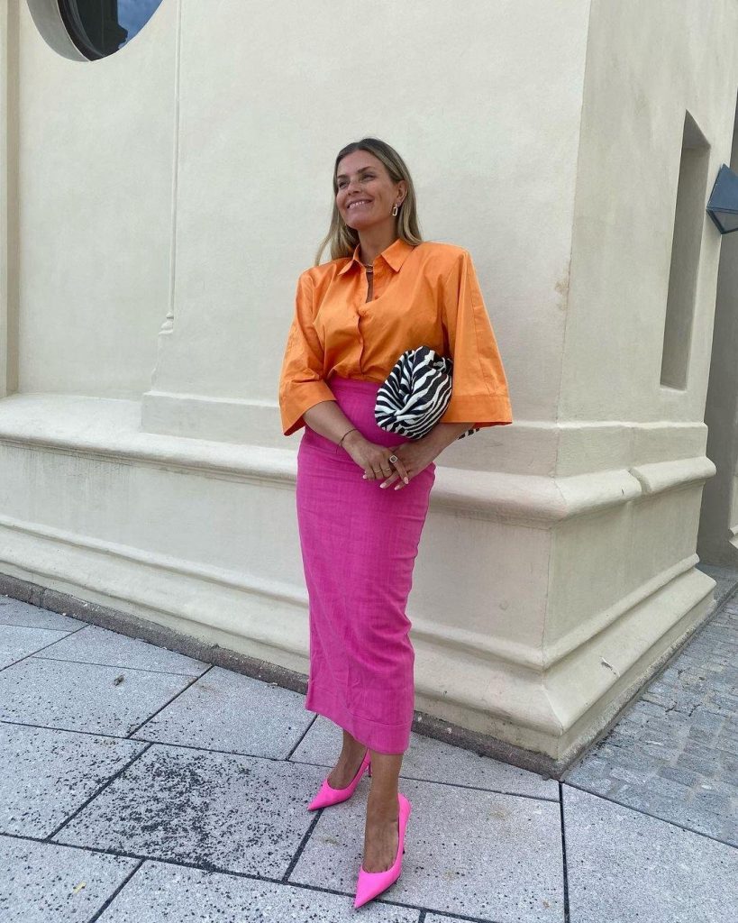 للتمتع بإطلالة جريئة وملفتة للأنظار لا تترددي في تنسيق توب باللون الفوشيا و بليزر باللون البرتقالي مع بنطلون جينز، أو فستان باللون البرتقالي مع إكسسوارات بلون الفوشيا، أو سويت شيرت برتقالي وتنورة فوشيا مع حقيبة وحذاء باللون الأخضر مثل إطلالة Mariana Machado.