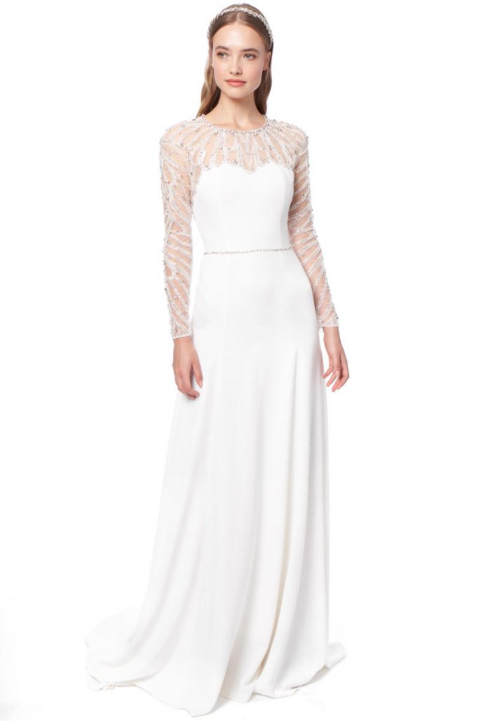 من توقيع مصممة الأزياء جيني باكهام Jenny Packham اخترنا لك هذا الموديل المزوق بأكمام شفافة وتطريزات لامعة تخطف الأنظار لكنها بسيطة وراقية .