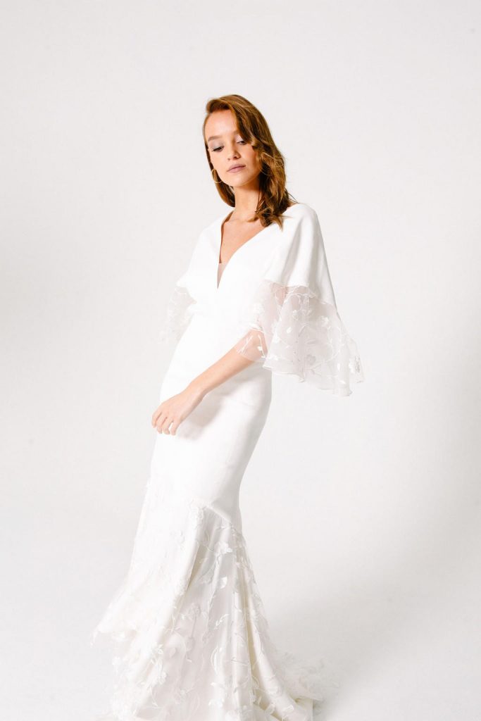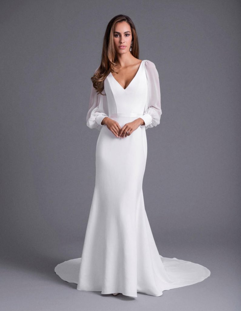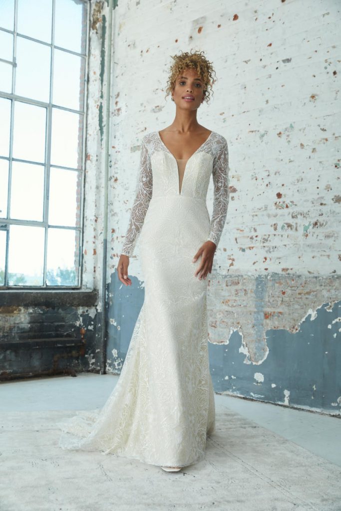 من ماركة Les Aimants اخترنا لك هذا الموديل البسيط والناعم المزود بأكمام طويلة وشفافة مع تنورة بقصة ذيل السمكة للعروس الرومنسية الحالمة.