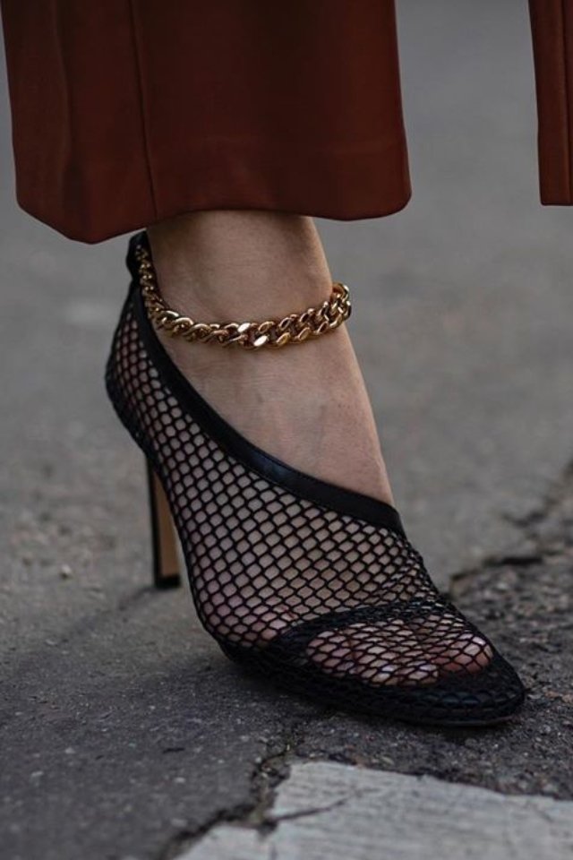 من الموديلات الجديدة والرائجة صندل ذو سوار معدني على الكاحل يشبه الخلخال، يمكنك تنسيقه مع فستان قصير أو تنورة، أو بنطلون يصل إلى الكاحل.