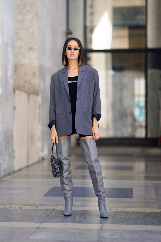 لاتترددي في تنسيقه مع بليزر فضفاض وبوط طويل يصل إلى الفخذين.