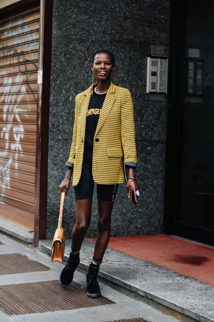لإطلالة رياضية باللون الأسود الملكي يمكنك ارتداء الشورت ، مع بلوزة قصيرة ، وجزمة عالية حتى الكاحل وسترة.